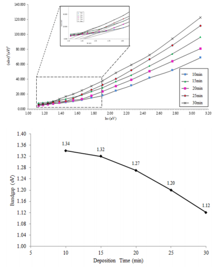 Overall, the time dependent parameters that effect the band gap are expected due to reorganization of the film and self-oxidation of the film which is apparent in SEM studies. By filling the voids in the film as the deposition time increases, denser films and smaller energy gap is expected.