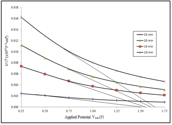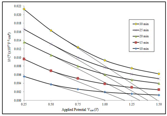 The Mott-Schottky plot of NiX2(X=S,Se) thin films is shown in Figures 10 and 11 and their corresponding semiconductor parameters summarized in Tables 4 & 5, respectively. Intercepts of plots on voltage axis determine the flat band potential value of the material. Flat band VFB, potential forms when the band bending of the material is affected by the external voltage, in no space charge layer.48 Flat band provides information on charge transfer process across the semiconductor-electrolyte junction of PEC cell. Figure 10 shows the Mott-Schottky plot for NiS2 thin films at different deposition time. The values of semiconductor parameters obtained for the films are shown in Table 4. The flat band potential (VFB) value is observed to increase from 1.00 to 1.48V as the deposition time increases.