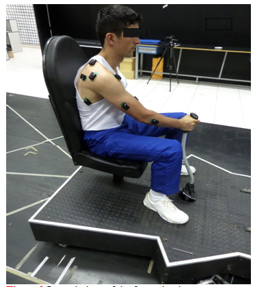 The total time for each direction was 60 seconds. The load in Kgf in these movements was 30kgf and is equivalent to the maximum force applied to the spot during the execution of stunts on the T-27 aircraft subjected to a 5Gz + gravitational force.9 EMG recordings. The sampling frequency of the surface EMG signal was in the order of 2000Hz. The electrodes used were distance between the electrodes was 20mm from center to center Figures 4‒7 shows the execution of the analyzed movements.10