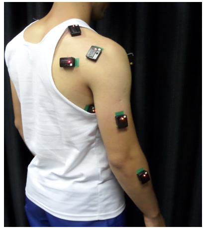 A surface electromyography system (Trigno, Wireless EMG system, Delsysinc, Boston, MA, USA) was used to record muscle activity of the upper-limbs. The electric signal of the Prototype for the SFA-EMB312/T27 (University of Sao Paulo, Ribeirao Preto, SP, Brazil) was used for the skeletal muscles most active in performing maneuvers and acrobatics (Figure 2).