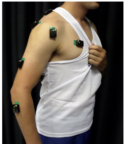 Participants were informed on the procedures and objectives of the study. After participants have signed the informed consent, all procedures for data collection were conducted at the Laboratory of Biomechanics and Motor Control (LABIOCOM) of School of Physical Education and Sports of the University of São Paulo (EEFERP-USP). Prior to data collection, the skin was cleaned with isopropyl alcohol, upper limbs hair were scraped, and a light scraping of the skin was performed to remove dead cells. Thereafter, surface electrodes were placed on the belly of 10 muscles (flexor carpi radialis, extensor carpiulnaris, brachial biceps, brachial triceps, anterior deltoid, posterior deltoid, upper trapezius, pectoralis major, infraspinatus, and latissimus dorsi), following the Surface Electromyography for the Noninvasive Assessment of Muscles (SENIAM) recommendations (Figure 3A)(Figure 3B). Surface electromyography was used as it provides greater comfort for the volunteer and is easy to manage for the researcher.8