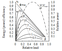 Their main feature is that the power (and in particular, exergy) efficiency of any real energy converter goes to zero twice: at idle (B = 0), i.e., in the absence of a useful product output, and in the "short circuit" mode (B =1), i.e., in this case, when all the supplied energy is dissipated. Thus, the dependence of the efficiency of any real installation has the character of an asymmetric bell-shaped curve, which has an increasingly pronounced maximum with an increase in . At the same time, the modes with maximum efficiency and maximum power (dash-dotted line) also diverge more. This significantly complements the results of the analysis of the efficiency of power plants of several types and brings them closer to reality.