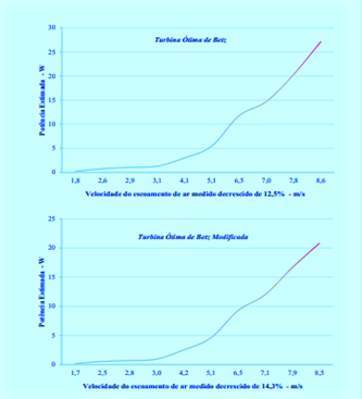 Power curve: When analyzing the extracted power, calculated for that type of turbine, it was found that the TOB (Optimal Betz Turbine) extracts 22.2% more power from the air flow than the TOBM (Modified Optimal Betz Turbine), (Figure 12).