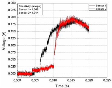The shock tube performance is based entirely upon the pressure ratios and speeds of sound in driver and driven section. Since, the strength of the shock increases with increase in the ratio of speeds of sound, it is desirable to have a driver gas with a low molecular weight and driven gas with a high molecular weight. So, the strongest shock wave can be obtained by using a heavy driven gas and a light driver gas. While meeting these requirements, the present investigation is aimed for two driver gases (nitrogen and helium) with air in the driven section and the fundamental one-dimensional relations are used to find the performance parameters of the shock tube.17 The complete schematic overviews along with the components of shock tube are shown in Figure 1. Initially, an aluminum diaphragm separates the driver and driven section of the shock tube. At the beginning of experiment, the pressure inside the driven section (region 1) is maintained at 0.18 bar and all the valves are closed. The driver section is filled with nitrogen through a high pressure cylinder (region 4) and the diaphragm ruptures at a pressure of 20 bars. The sudden rupture of diaphragm due to pressure difference across the drive and driven section of the tube creates a shock wave that propagates into the driven section. The gas flow starts as a jet and increases as the diaphragm opens, until the cross section of the tube is filled and the shock wave being formed in this process. The sudden rise in pressures across the shock wave induces mass motion in of the driven gas (region 2). The primary shock gets reflected from the end plate, thus forming the reflected shock propagating into a medium which is already at elevated pressure and thereby forming a further increase in pressure and temperature of driven gas (region 5). The pressure jumps across the primary as well as reflected shock are captured from the pressure transducers Figure 2. From this pressure signals, the time taken by the shock wave to travel a distance of 500 mm (between pressure transducers) is obtained and subsequently, the shock Mach number Ms is calculated. Further, the analytical expressions (Eq-1) are used to compute the pressure and temperature ratios across primary and reflected shocks.17 The results plotted in Figure 3 have shown very good prediction within the experimental uncertainty of ±10% (Figure 3).
