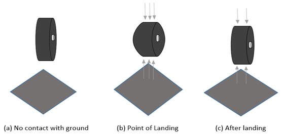 Furthermore, reference maximum landing weight (77,300kg) of Airbus A321NEO was used as the initial loading criteria,15 followed by subsequent loading values at increasing intervals. That is, when the loads (maximum aircraft landing weight) were applied, oscillation of the tire model occurred and each amplitude of oscillation was noted accordingly. However, three aircraft landing scenarios considered for this study included no contact with ground, point of landing and after landing but this study is focused on the point of landing (or point of contact with the ground) where the aircraft tire had full contact with the ground as presented in Figure 2.