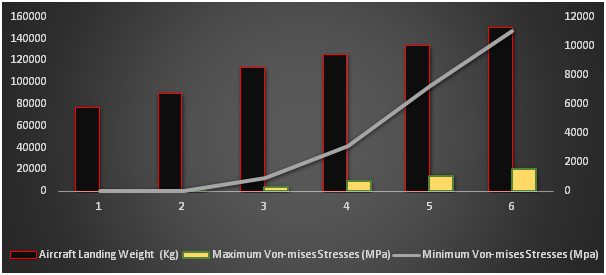 Stress variation on tyre model with respect to increasing aircraft landing weight was simulated and the maximum and minimum von-mises stresses were recorded as shown in Table 1. Figure 3 is a graphical illustration of the von-mises stress values in response to the aircraft landing weight. Figures 4‒9 show the stress plot and their effects on the geometry of the aircraft tire at increasing aircraft weight.