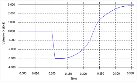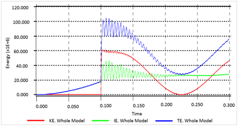 To determine if the model is stable, energy distribution plot for Kinetic Energy (KE), internal energy and the Total Energy (TE) was analysed for the tire model. For 0.1s, the kinetic energy was zero because the tyre was stationary for this period. Within the 0.1s the internal energy increases because of the inflation of the tyre. Since total energy is a summation of the kinetic energy and the internal energy, the total energy also increases with the increasing internal energy till it reaches 0.1s. At this point the tyre begins to move and the kinetic energy increases and the total energy changes with the changing kinetic energy since the internal energy remains somewhat stable for the remaining period of the simulation. The sudden increase in the velocity of the tyre causes a small vibration in the model. Figure 12 represents the maximum landing velocity obtained for the tire model.