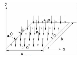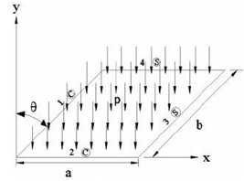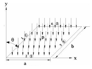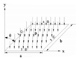 a, plate length; b, plate width; E, modulus of elasticity, h, plate thickness; M, Bending moment; P, exciting load per unit area; u in-plane displacements in x-axis; v in-plane displacements in y-axis; v, Poisson’s ratio; w, plate displacement; γxy, shear strain; εx, in-plane strains in x-axis; εy, in-plane strains in y-axis; σx, normal stress in x-axis; σy, normal stress in y-axis; τxy, shear stress; ρ, density