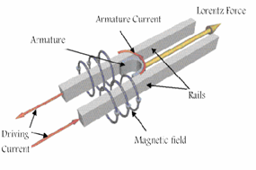 The rail gun is made up of two parallel metal rails and a frame that moves along these rails. They are suitable for launching large projectiles. When a voltage is applied to the rails, the armature completes the current cycle and current flows through the armature. A magnetic field created by the current flowing in the rails generates a force that is applied to the armature. The armature moves as a result of this force and the projectile connected to the armature are launched. A coil gun structure and operation principles are more complex than those of rail guns. This includes a cylindrical frame, one or more coils within the cylinder, and an ejected projectile. Because there is no friction between the projectile and the muzzle in coil guns, the acceleration is not harmed. Although, the rail gun speed is faster than the coil gun speed, the required excitation current, on the other hand, is much higher. Rail guns are also prone to melting and erosion. The coil gun is more efficient than the rail gun due to the robust magnetic connection between the coils and the projectile.