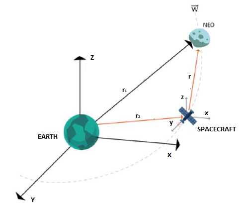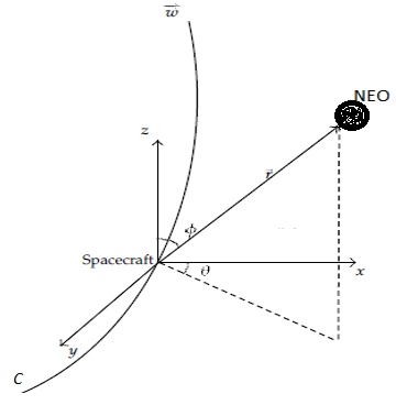 That is, the vehicle's trajectory, C, is on a plane that is perpendicular to the X-axis, which points away from Earth. The flight direction is the Y-axis direction and the Z-axis is perpendicular to the plane of the vehicle's orbit. Angle f is outside the XY plane and angle theta q is the angle that the projection of the relative vehicle-NEO position makes with the X-axis onto the XY plane. The vehicle follows a circular path around the Earth with constant angular velocity . The relative position between the two objects (vehicle and asteroid-NEO) is, measured from the center of the vehicle, where the XYZ reference system is fixed. The relative distance between the two objects (vehicle and asteroid-NEO) is r, measured from the center of the vehicle, where the XYZ reference system is fixed. The kinetic impact will occur when or when the gravitational effects between the bodies are strong enough to cause the desired NEO trajectory deflection.