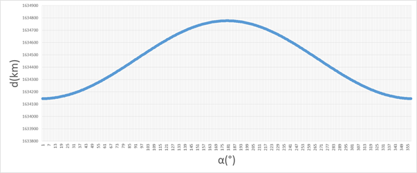 This graph was constructed for an angle in the fixed plane, α = 10 degrees, and indicates that there is an angular region for the angle outside the orbit plane β that is favorable for the NEO approach to Earth and another that is unfavorable. The best angle was around 165 degrees which gives the greatest separation D. With this angle fixed, we look for the optimal angle in the orbit plane, that is, the α angle. Figure 5 shows the results. For this simulation we set the out-of-plane angle at β=165 degrees. The other factors remain with their constant values.