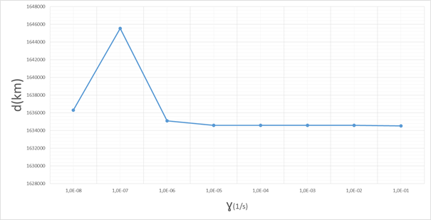 In this case, we found that the optimal angle was 180 degrees. With this pair of optimal angles, we can test the best value of the thruster initial velocity module to achieve the final greatest distance between the NEO and the Earth. Figure 6 shows the result.