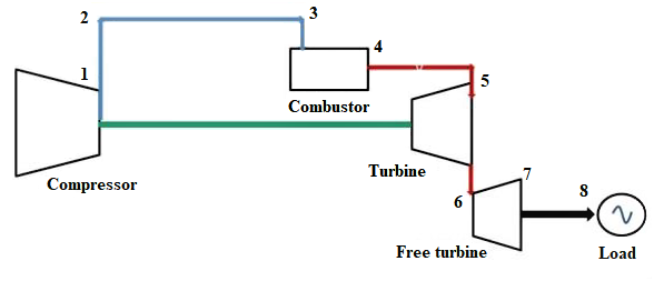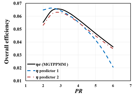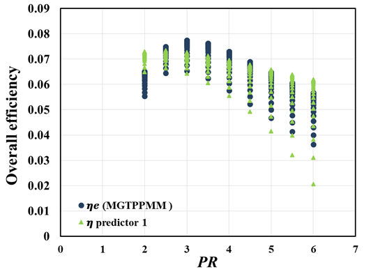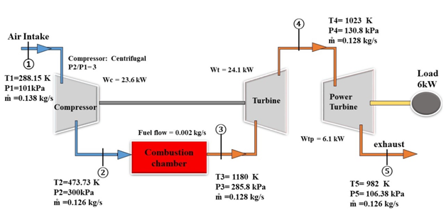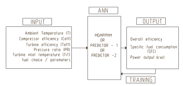 The model has five inputs, namely, isentropic turbine efficiency( ), isentropic compressor efficiency ( ), ambient temperature ( ), pressure ratio (PR), and turbine inlet temperature (TiT), as well as three outputs, fuel consumption, power output, and overall efficiency. The complexity of aerothermodynamics analysis makes it impossible to mathematically solve the optimization equations involved in various gas turbine cycles. The effects of different parameters have been analyzed to select the optimum gas-turbine configuration to reach high efficiency. The system represents as proposed in the reference.14