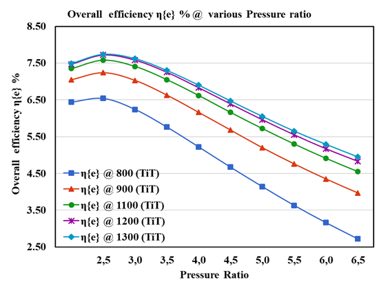From figures 5 & 6, the optimized pressure ratio as 3, the turbine inlet temperature as 1200 K which yields a net efficiency of 7.7% was estimated. GT efficiency is about thermal circulation that has been strongly affected by the overall profitability of electrical energy. To improve the performance of power plants with the improvement of energy productivity and the reduction in fuel consumption.