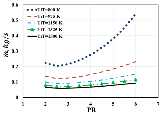 Figure 6 The relation between mass flowrate and pressure ratio at various turbine inlet temperatures.