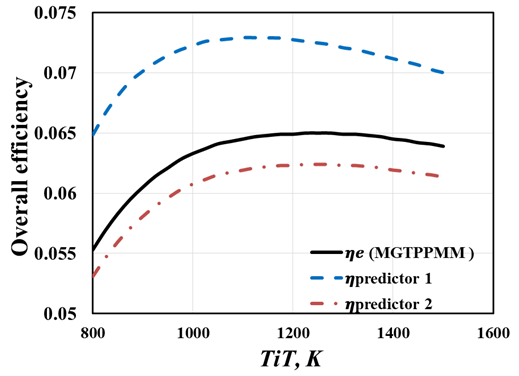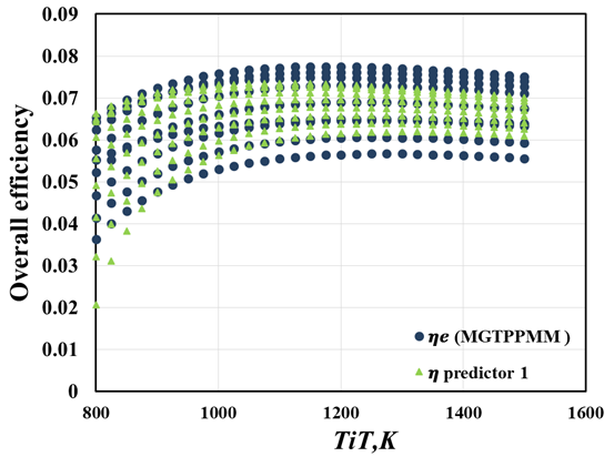 Figure 7 The relation between overall efficiency and predict efficiency on turbine inlet temperatures.