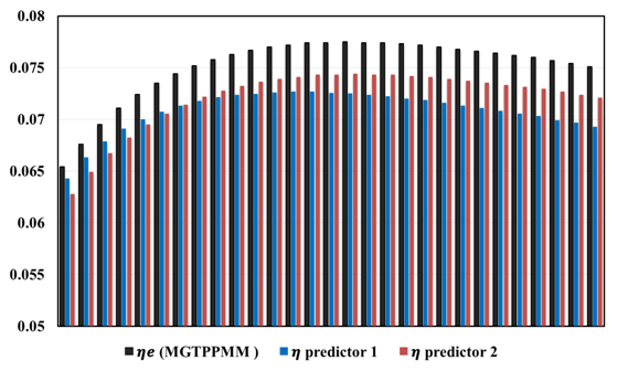 Figure 7 shows the result when the input is Turbine Inlet Temperature used to predict the gas turbines overall efficiency. Figure 8 shows the result when the input is the Mass flow rate used to predict the gas turbines overall efficiency. Figure 9 shows the result when the input is the Pressure ratio used to predict the gas turbines overall efficiency. In figures 7-9 all the three models and their predicted efficiency are plotted. Predictor 2 has a better response to the simulated value. In figure 10 the bar graph shows the predicting accuracy of the efficiency between the three different models. The height of the bar chart shows the values almost equal to the simulated value.