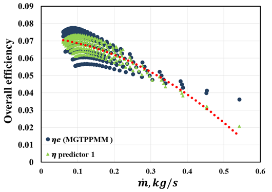 This paper reviewed the thermodynamic principles of single shaft gas turbines and discussed the cycle characteristics of the model presented as MGTPPMM. They have been verified with the Jet Cat pht3 lab model. Two data-based efficiency predictor linear regression estimation (Predictor 1) and Random Forest Decision Tree (Predictor 2) were developed. Among the predictors, Random Forest Decision Tree is better in terms of Accuracy score and has better quality of the overall efficiency predicted as close to the data simulated. In the future, k-means clustering or other such models can be used to check the prediction accuracy. Even hybrid models could be incorporated. The models in the future could be able to work even in an unlabeled data environment. Here multi-label Semi-supervised learning methods were proposed and their results were explained. The simulation tool ASTRA data output could be used to create the training data set for the Artificial neural network (ANN). The ANN consists of several neurons that are processing units between layers. The gas paths are depicted as the layers. These models are described in detail in.18-21 The input and the output are shown in figure 4. The neurons work independently to the other nodes. The neurons gain information from the input layers which are processed and sent to the output layer. The connection between the neurons is stronger if the information is a priority and could be set with higher weights also known as the synaptic weights.