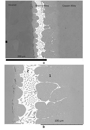 Figure 2a shows a micrograph of the joint, where the CuCrZr, Brazing Alloy and Inconel are well distinguishable. More in details, (Figure 2b), inside the Brazing Alloy two zones are evident. Zone 1 is made of a copper matrix with silver rich precipitates, and the composition of this zone is richer in copper to respect the eutectic composition of the alloy employed in the brazing process (Table 2).