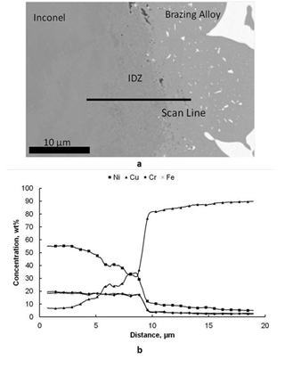 Figure 4a Interface between Inconel and brazing alloy with the IDZ; 4b Concentration profiles of Ni, Cu, Cr and Fe among the interface.