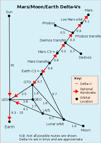 Delta-v symbolized as ∆v as used in spacecraft flight dynamics, is a measure of the impulse per unit of spacecraft mass that is needed to perform a maneuver such as launching from or landing on a planet or moon. The delta-v from the lunar surface to Mars orbit is less than from the surface of Mars. While delivering payloads from the Moon to Mars orbit would take considerable time, if lunar industry has developed to meet demand from Earth orbital and cislunar industrial and commercial facilities meeting the additional needs of developing industrial capacity to serve needs of relatively small numbers of settlers on the Mars surface might be better met from manufacturing and assembly operations in Mars orbit using lunar materials than attempting to launch from Earth or building materials processing and manufacturing on the Martial surface.