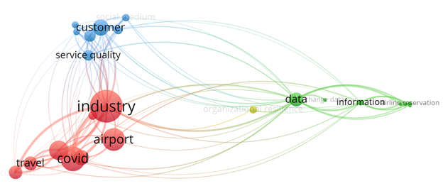 The airline business is extremely sensitive to economic dynamics. To elaborate, the authors used the keyword of “airline business recovery” through the Web of Science database and VOSviewer process to conduct a bibliographical analysis and discovered that two clusters tourism industry and customer satisfaction have been closely tied to data cluster where data was the key component to identify business deficiencies and the customer loyalty, which helped continue enhancing resilience during the economic recession such as the global pandemic (Figure 3).14