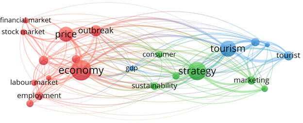 Another quick bibliographic analysis using “pandemic market recovery” as the keyword. The result showed three vital indicators including economy, strategies of sustainability, and tourism (Figure 4) that had been predominately concerned and studied. The economy cluster included the labor market, employment, financial market, stock market, price, and outbreak.