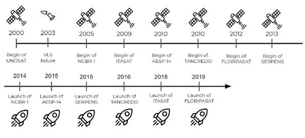 The first small satellite produced in Brazil by an institution was in 2000, when the University of North Paraná began the UNOSAT project. It took 3 years to be produced and launched, but unfortunately, it did not go to space because of its launcher explosion. After that incident, it took 11 years until the next launch (NCBR-1), even though its project began in 2005. Between 2014 and 2019, Brazil launched a total of 6 nanosatellites, more than one per year (Figure 3).