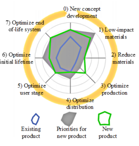 Qualitative assessment tools enable us to evaluate a product through its environmental impacts according to multi-environmental criteria. The Eco-compass, shown in Figure 3,26 is a graphical model considering six design criteria. It ranges existing products from 0 to 5. Among the tools for quality assessment, we have selected the "Lifecycle Design Strategy"(Figure 4).27