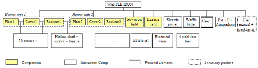 In the approach used here, we first produced an organic decomposition of the whole product by identifying the different components and component interaction, external elements and accessory product (Figure 7). In this figure, the main components and external elements are represented. To make this decomposition more readable, we have identified some components of interaction without systematically linking them to other components with which they interact.