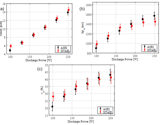The performance results of CAM200-EM, in terms of, thrust, specific impulse and anode efficiency, at ASRI and Sitael facilities are presented in (Figure 3A)(Figure 3B)(Figure 3C). It can be observed from the figures that both tests presented performance results within the estimated error bars. In particular, the thrust measured at 100 W is at least 4.88±0.35mN with specific impulse of 900±66sec corresponding to thrust efficiency of 21±2.8%. This very low power performance, although lower than with higher power HETs, is higher than the performance measured with other similar low power Hall thrusters. Additionally, at the maximum power examined (250W) the measured thrust is at least 13.9±0.6mN with specific impulse of 1570±73sec corresponding to thrust efficiency of 43±3.7%. The specific impulse and the corresponding thrust efficiency values are in accord with high power Hall thrusters that generate thrust-to-power ratio of 60mN/kW (55.6mN/kW for the CAM200-EM at Pd=250W). The similarity between thruster performances measured in both facilities validates CAM200 thruster performance as was recorded and published in past years.