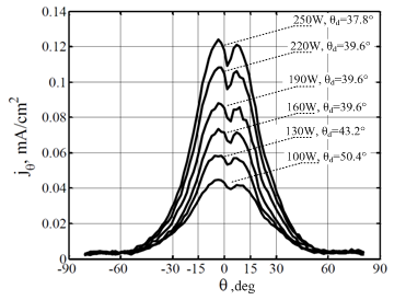 This is the first time ion flux measurements in the plume of the CAM200 thruster are measured. This experiment was performed using the Sitael Faraday probe diagnostics system. The facility creates a close-to semi-spherical picture of the ejected ion current density around the thruster. To measure the distribution of the ion current density around the thruster CAM200 was operated in its six operational points, also described above. At each point the array of Faraday probes rotated around the thruster in the -90° to +90° angle range. Measured values of current density are presented in Figure 4. It can be seen from the figure that the measured values of current density are in line with similar measurements conducted with other thrusters.12‒14 Also, as expected, the lower the discharge power the lower the current density, due to lower mass flow rate and reduced concentration of charged particles. With the acquired data it is possible to compute the half beam divergence angle and correlate it with the performance parameters obtained from the test. The corresponding half beam divergence angle for the CAM200, containing 95% of the ejected ion flux, is lower than 40° for discharge power 160W and higher, also presented in the Figure 4. This measured result strengthens the postulation and numerical analysis that indicate on a focused ion beam ejected from the thruster, helped by its anode co-axial design, and assuring good performance at low discharge power.