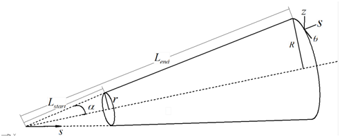 In a cylindrical coordinate system, the generatrix direction and radial direction of the conical shell are defined as the coordinate direction. The position of any point on a conical shell can be described as