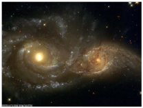 Nebulae taking part in its rotation, small and large celestial bodies, stars, and their clusters form visible "arms" of galaxies, which become "thinner" as they accelerate and sometimes stretch into very long filaments (Figure 6). Such threads penetrate the entire visible part of the Universe (Figure 9), which is the reason to call them the "web of the Universe". Its presence testifies to the prevalence in space of the phenomenon of substance overflow from one star or galaxy to another. This overflow of broadcasting is especially clear in "close systems of double stars or galaxies" (Figure 10). In this figure, the feature of this process is very clearly manifested, consisting in the invariability of the position of the centers of star clusters, while the peripheral layers move with acceleration. This confirms the existence of gravitational equilibrium, since ∇ρ=0 at their centers of clusters. Equilibrium is violated only for the peripheral layers of these galaxies, where отличρ are nonzero. They also experience gravitation, in which one star or galaxy, as it were, "strips" another. At the same time, it also follows from Fig. 10 that it is not necessarily the smallest of the galaxies that “undress”: everything depends on the spontaneously arising density gradient of matter in a particular region of space, as it follows from the bipolar law of gravity (1). This law also easily explains why a significant part of the baryonic matter formed in the core of a spiral galaxy is ejected from its center in the direction of the rotation axis. The answer is that it is in this direction that the gradient of its density ∇ρ, and, consequently, the gravitational force are minimal. Explains the bipolar law (1) and the concentric arrangement of galaxy clusters at a certain distance from the central cluster, discovered by NASA when building a three-dimensional map of the Universe.7 According to Newton's law, such an arrangement of clusters of stars is impossible due to their mutual attraction. However, according to the photograph in Figure 5, it really exists and is explained by the presence of gravitational equilibrium in the antinodes of star clusters, where ∇ρ=0.