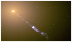 However, the condensation process occurs only when a certain density of non-baryonic matter is reached. Until then, the nucleus of any galaxy, like voids free of baryonic matter, is generally invisible, although it has nothing to do with BH. Such a core is transparent, which is reflected in Figure 1. It can be detected only by the motion of baryonic matter, carried away by the flow of non-baryonic matter. However, as it becomes denser and the condensation process occurs, the core begins to emit "jets" and becomes more and more luminous. This glow stops only with the "aging" of the galaxy, when the galactic nucleus becomes more homogeneous, and the relative value of the pressure gradient ∇ρ/ρ and the associated accretion of baryonic and nonbaryonic matter weaken. When approaching this state, the jets become unstable (pulsating), and their directionality is less pronounced. With the weakening of the jets, the condensation region shifts to the “accretion disk”, where the “production” of non-baryonic matter is mainly carried out.