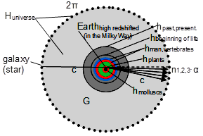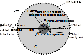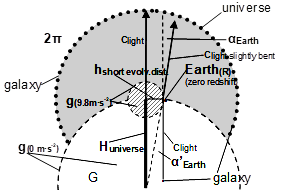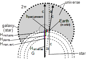 This distance depends both upon the ratio of the shift of the spectrum line, which matches to the motion of the Earth, and of the gravity of Earth (Figure 1). The “short evolving distance” (hpast, present) can be given by the ratio of the entire plane angle (2∙π) and the deviating angle (α) of a light beam passing near the Earth’s surface caused by the gravitational field: h/α=H/2∙π-1.28 With the ratio calculated from the known “short evolving distance” (h) and the known two angles (α, 2∙π), an enormous unknown distance can be calculated which might be termed ”long evolving distance” (Hpast, present = Huniverse) (Figure 2).