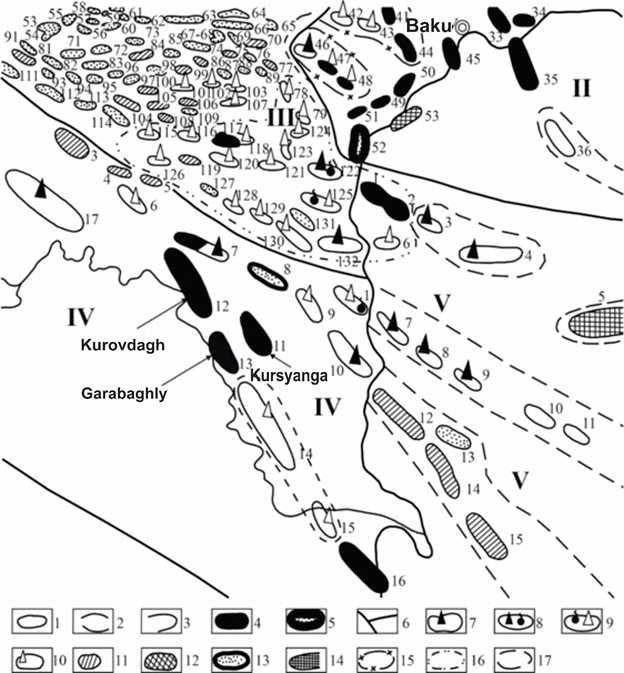 IV – Prikurinsk area: 1 – Pirsaat; 3 – Kalamaddin; 4 – Boyuk Harami; 5 – Kyrlykh; 6 – Kichik Harami; 7 – Mishovdagh; 8 – Qalmas; 9 – Khydyrly; 10 – Byandovan; 11 – Kursyanga; 12 – Kurovdagh; 13 – Garabaghly; 14 – Babazanan-Durovdagh; 15 – Khylly; 16 – Neftchala; 17 – Padar