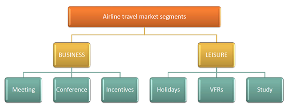 According to Wensveen28 airline market segmentation is the process whereby an airline divides potential customers for one of its products or services into a meaningful consumer group, or market segments. Shaw40 further notes that ‘a market segment comprises a group of customers who have sufficient in common that they form a viable basis for a product/price/promotion combination’. In the world airline industry, market segmentation is a customary practice principally aimed at separating business-oriented travel from leisure-oriented travel. Hence, airlines have historically segmented passengers into two distinct categories based on the reason or purpose for travel: business and leisure.25,41,42 Below this level, business travelers may be travelling to attend conferences, or a marketing or travelling on a reward program incentive (Figure 1). Leisure travelers may be travelling on holidays, or for study purposes, or visiting friends and relatives (VFRs) (Figure 1). Importantly, there are some markets that principally attract business travelers, whilst there are other markets that are dominated by leisure travelers.42