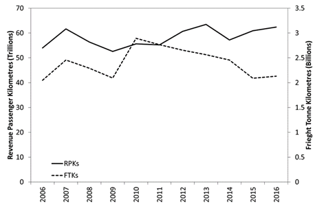 Figure 2 Thai Airways International total annual revenue passenger kilometres performed (RPKs) and freight tonne kilometers performed (FTKs): 2006-2016.