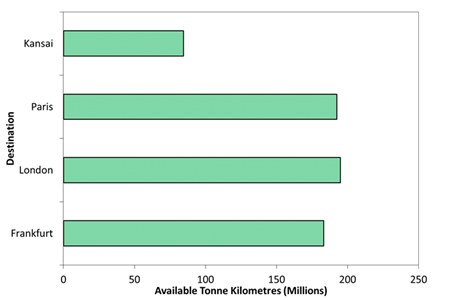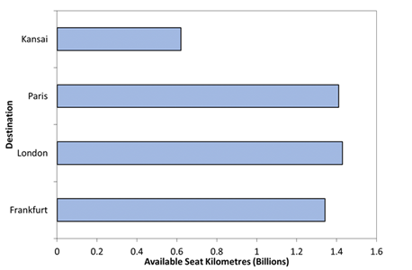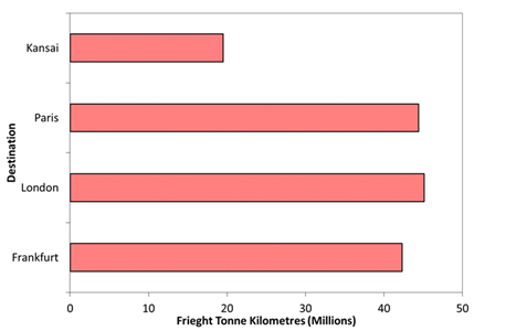 As previously noted, the available tonne kilometres are a measure of the tonnes of air cargo, mail and passengers that may be carried on an aircraft times the distance that they are flown.110 In order to calculate the total ATKs produced by Thai’s Airbus A380-800 services the weight of the cargo112 and the weight of the passengers and their baggage23 were combined to determine the mass of payload that would be available for transportation on each flight stage length. Once again, Figure 9, shows that Thai’s Airbus A380-800 services from Bangkok to London will produce the most ATKs. The services to Paris and Frankfurt will produce 192.4 million and 183.2 million ATKs, respectively (Figure 7). The daily Airbus A380 services serving the Bangkok to Kansai International Airport and return will generate 84.6 million ATKs. However, as noted, the total payload on a flight for the carriage of air cargo is subject to a range of restricting factors, such as temperature restrictions or prevailing winds, which could adversely impact the ability of the aircraft to carry the cargo that is tendered for transportation. In the event of payload restrictions, then the available tonne kilometres will also be affected due to the lower weight of payload being carried on that service. Figure 8 once again shows that 87 per cent of the available tonne kilometres (ATKs) performed by Thai’s Airbus A380-800 fleet will be on the European services. The Kansai International Airport services will produce 13 per cent of the available ATKs (Figure 8).