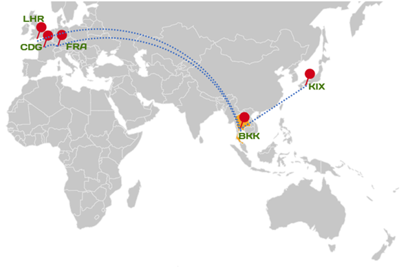 Legend: BKK, Bangkok; CDG, Charles de Gaulle Airport (Paris); FRA, Frankfurt; KIX, Kansai International Airport; LHR, London Heathrow Airport.