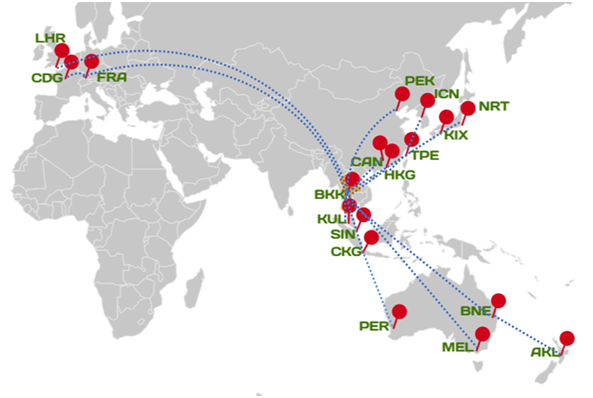 Figure 9 Thai Airways International Airbus A380-800 route network design.