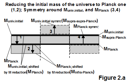 None of the four equations is the same unless the side is reversed. According to the solutions of the equation, the mass of Planck changes twice and the initial mass of the universe also changes twice. In case of double mass decrease and double mass increase, continuity is formed symmetrically on both sides (Eq.11.a, 11.b, and Eq.12.a, 12.b). Otherwise, if there is only a single mass decrease unilaterally or only a mass increase, the continuity is partial (Eq.11.a, 11.b, or Eq.12.a and 12.b). When we lose mass in the macro universe on the other side, there is a lack of mass (from total mass to visible mass of the universe). While an increase in Planck's mass in microphysics at the other end would also result in a lack of mass. To avoid mass/energy congestion, the increase in Plank mass shifts the initial mass of the universe up one level, in this way assuming a supra-supra Planck value. Reducing the initial mass of the universe shifts the Plank mass down to the infra-Plank value to avoid mass/energy accumulation.
