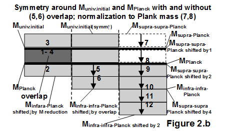 Figure 2b The left part shows the overlap (1-4) of the mass level caused by the increase in mass due to the formation of symmetry. The center column shows a unit downward shift (5 and 6) to eliminate the excess mass due to overlap congestion (3 and 4 /Fig.2.a/). The column on the right shows the reduction to Planck mass, which is now two steps (7, 8). This also results in a further two-step shift in the levels below them (9, 10 and 11, 12).