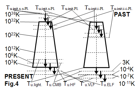 With this shift down 2 levels, 4 levels will appear below the Planck temperature. These four levels then move forward in time, under each step defined in proportion to the angles, from the beginning of the universe to the present day (see it later).