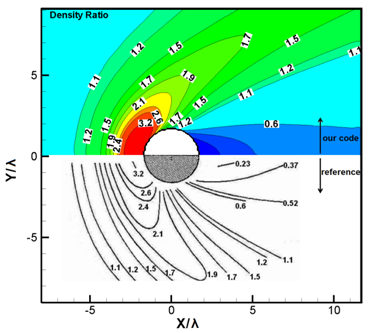 For validation of the developed DSMC code, the low density supersonic flow around the cylinder is simulated, which the free stream Knudsen number and the speed ratio are equal to 0.3 and 5, respectively. The characteristic length (L) set to the cylinder diameter. Figure 2 shows comparison of the density ratio of our DSMC code with reference,20 which are non-dimensionalized by the free stream mean free path as the reference length. It illustrates that the result has good agreement.