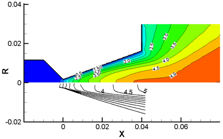 Figure 3 Comparison of the steady state Mach contour of plume expansion into vacuum from a convergent-divergent nozzle, up: this study, down: adapted from reference.21 The stagnation pressure and temperature in chamber are 6400 Pa and 699°K.