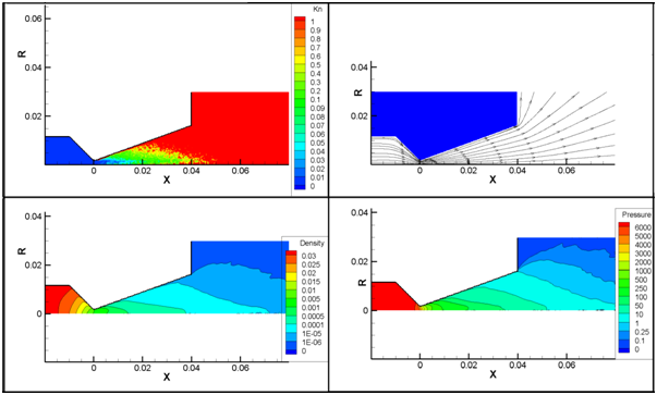 Figure 3 compares part of the region of steady state Mach contour of this study with reference.21 It shows desired agreement to confirm validity of the hybrid particle-continuum method and the utilized simulation code. Flow in the convergent nozzle and at the beginning of the divergent nozzle is low Knudsen number flow and consequently it is continuum. However, in most of the divergent nozzle, the continuity assumption is not established. Figure 4 provides Knudsen number, stream lines, pressure and density contours clockwise from top left, respectively. The flow regimes vary from continuum, at the nozzle throat, to rarefied, in the plume. The Mach number contour reveals that the sonic line intersects the nozzle lip. Moreover, it is observed that the boundary layer along the nozzle wall is thick. The hybrid solution indicates a significant velocity slip at the nozzle lip. And, the rapid expansion is illustrated by the large turning of the streamlines at the nozzle lip.