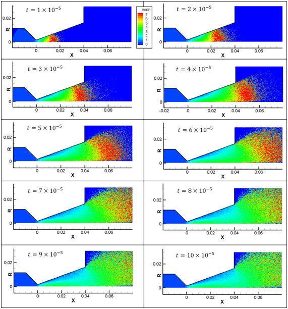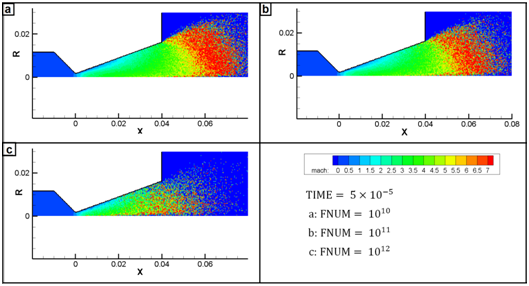 Figure 8 indicates the Mach number contours at 0.5 microseconds with different ratios of real gas molecules to simulation particles . It is observed that the ratio of 1012, unlike the ratios of 1011 and 1010, cannot simulates this unsteady flow properly, because the presence of less than 20 simulation particles in each cell will result in high statistical error. Also, the statistical error near the symmetry axis is more than the rest of the domain, for the reason that the smaller cells near the symmetry axis lead to the existence of less particles there.