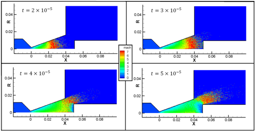 Finally, interaction of unsteady plume flow, which is in a situation as same as the previous section, with a rigid cross-section of cylinder is simulated. Figure 9 illustrates Mach number contours of the starting plume flow, which interacts with a cross-section of cylinder with a radius of 1 mm and at the distance of 1 mm from nozzle exit. It shows that the interaction begins at the time of . Also, in the further time steps, flow speed decreases in front of cylinder cross-section, and in a contrary manner, it increases at the cylinder lips. By comparing with the unsteady expansion without presence of cylinder, we can perceive that although there is not difference before than the time of in the flow patterns, the plume expansion is diminished in additional times.